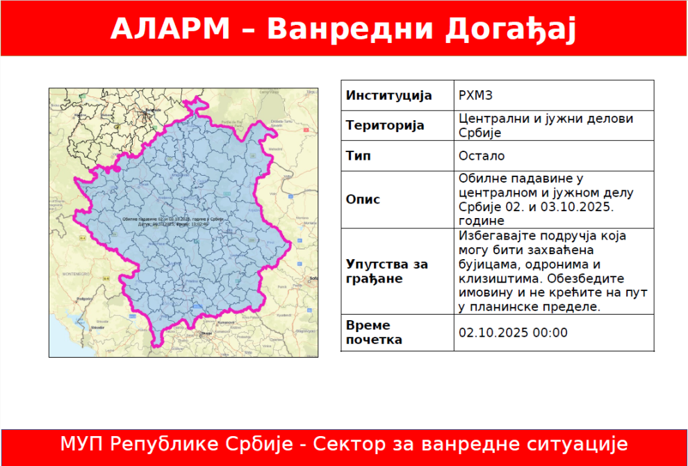 Usled obilnih padavina koje se na području centralne i južne Srbije očekuju u četvrtak i petak, 2. i 3. oktobra, Republički hidrometeorološki zavod (RHMZ) pokrenuo je sistem za prenos SMS hitnih informacija građanima.