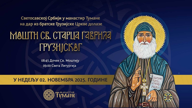 U nedelju, 2. novembra 2025. godine manastir Tumane biće domaćin još jednog velikog duhovnog događaja – dolaska moštiju Svetog starca Gavrila Gruzijskog, koje u Srbiju stižu kao dar bratske Gruzijske Pravoslavne Crkve.